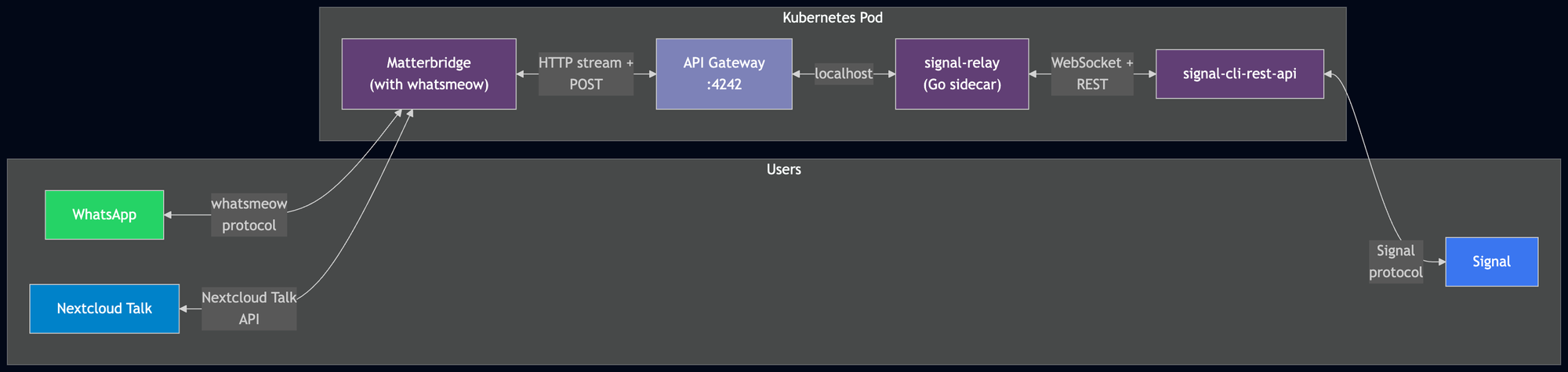 Matterbridge runs as a StatefulSet with a persistent volume for the WhatsApp session data. signal-cli-rest-api is a separate StatefulSet with its own persistent volume for the Signal session. The Go relay runs as a sidecar container on the Matterbridge pod, sharing localhost for API communication.